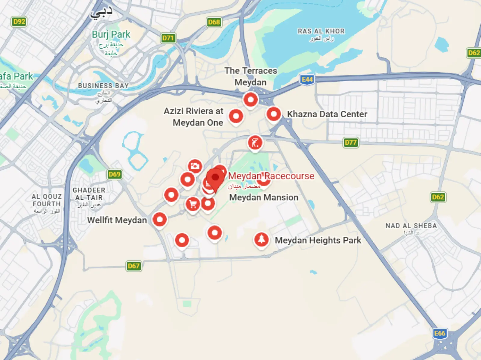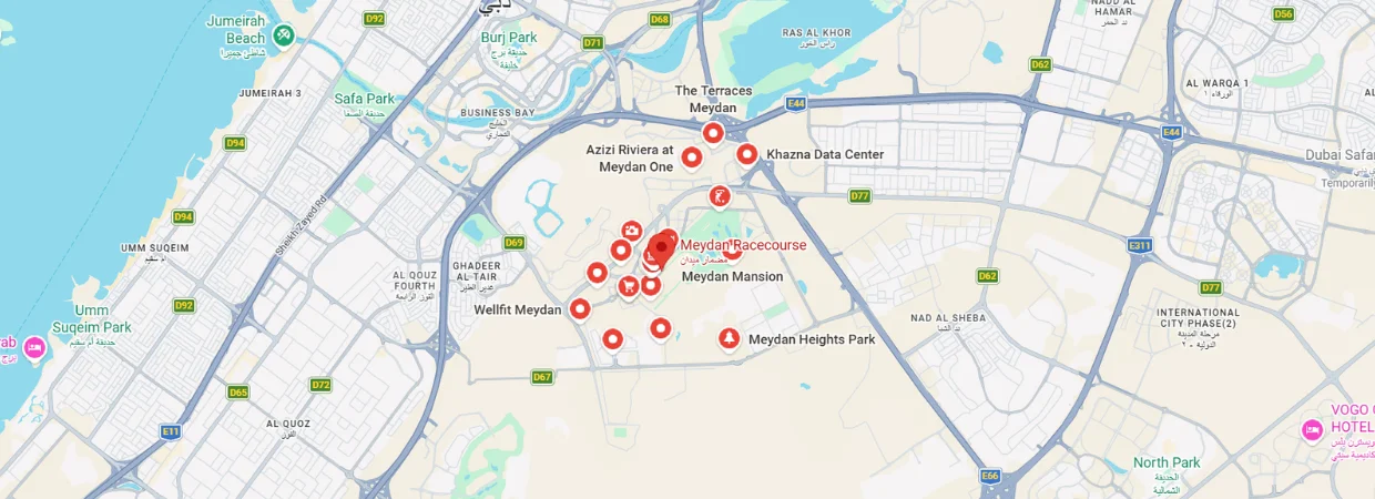 The district is a global entertainment and leisure powerhouse, famously hosting the Dubai World Cup at the spectacular Meydan Grandstand. On a daily basis, residents can play a round of golf at The Track, cycle through the dedicated Nad Al Sheba Cycle Park, or enjoy waterfront strolls along the connected Dubai Canal. For premium dining and socializing, high-end venues like Soho Garden and Iris Dubai offer world-class nightlife right within the community boundaries